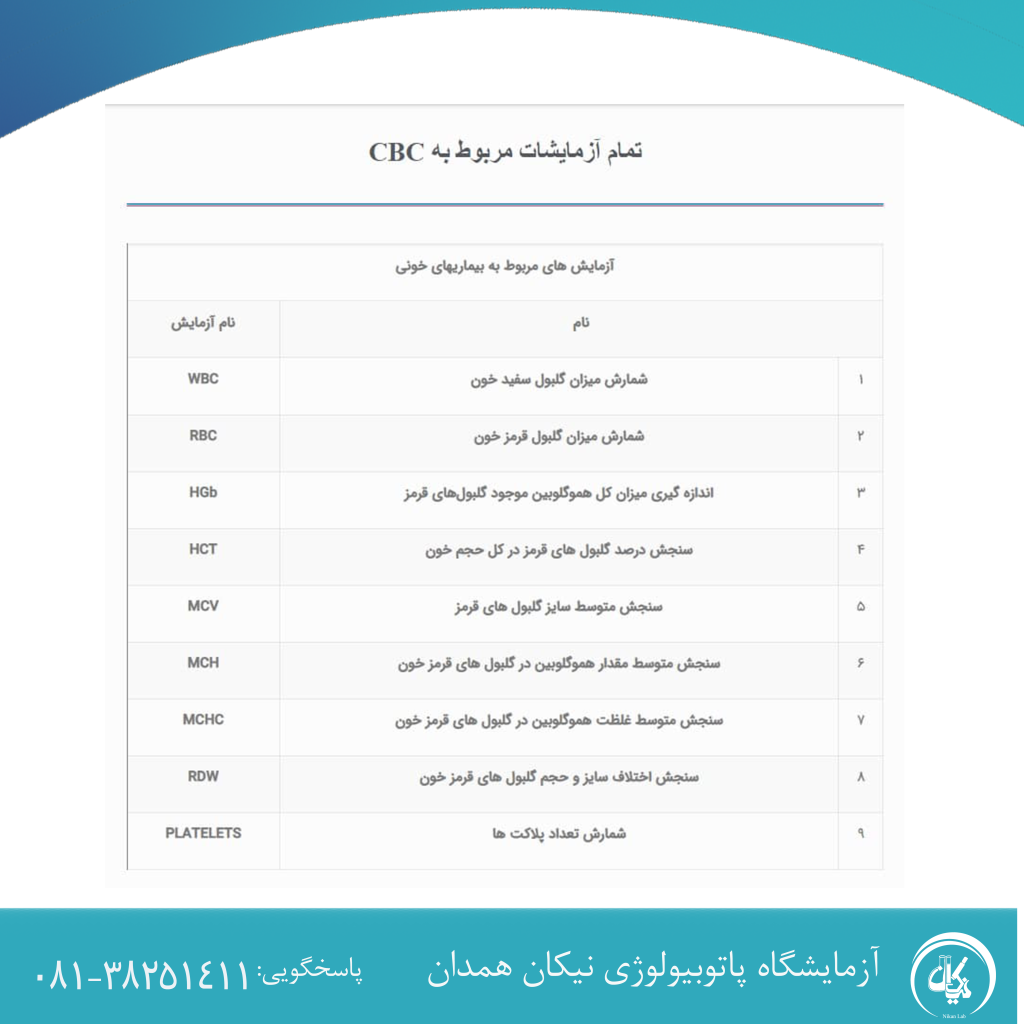 آزمایش CBC یا همان شمارش کامل خون یکی از رایج ترین آزمایش های خون است که برای ارزیابی سلامت عمومی و تشخیص انواع اختلالات از جمله کم خونی، عفونت، لوسمی و غیره مورد استفاده قرار می گیرد. افزایش یا کاهش غیرعادی در تعداد سلول ها ممکن است که نیاز به آزمایش بیشتر داشته باشد.